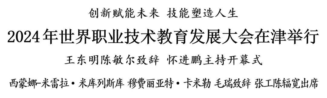 11月21日,2024年世界职业技术教育发展大会在津举行。全国人大常委会副委员长、中华全国总工会主席王东明,市委书记陈敏尔致辞。教育部部长怀进鹏主持大会开幕式并作主旨报告。联合国教科文组织大会主席西蒙娜-米雷拉·米库列斯库视频致辞,埃塞俄比亚劳工与技能部部长穆费丽亚特·卡米勒、新西兰驻华大使毛瑞致辞。市委副书记、市长张工,市委副书记、市委教育工委书记陈辐宽出席。