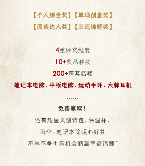 在指定书单中沉浸阅读,累计时长越久,排名越高!不仅能赢额外积分奖励,更有机会一举拿下“书仙奖”。大牌头戴式耳机等你带回家!“书痴”“书迷”也有专属好礼。这个秋天,用阅读时长证明你的热爱!